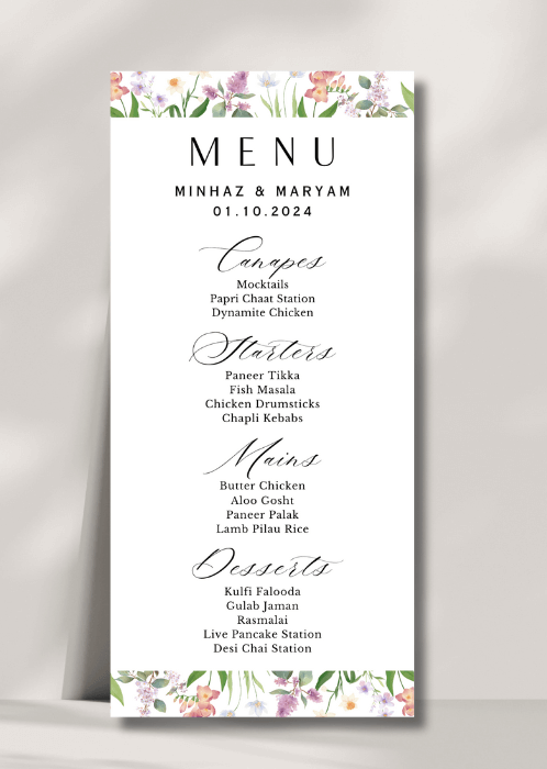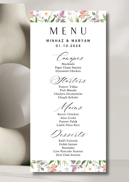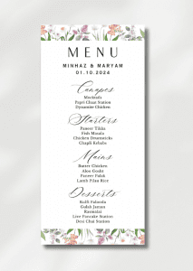 The card delicately displays your names and engagement date before disclosing the delicious details of your canapes, starters, main course and dessert options.