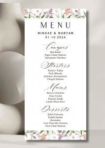 Our elegant Lilac x Floral Garland Menu announces all the dining details in store for your beloved guests. This beautiful design features delicate illustrations of freesia and daffodils framing the details like a meticulously crafted garland.