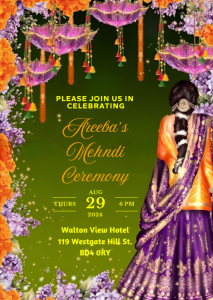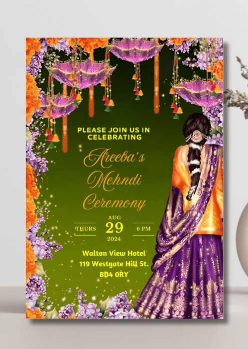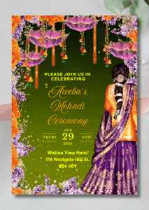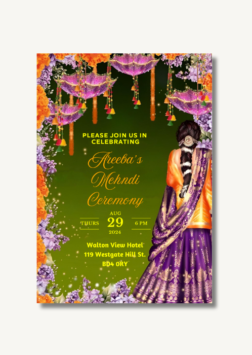 Welcome your guests in style with our elegant Lilac x Marigolds Mehndi Invitation. This vibrant design features a colour palette of purples and orange with decorative umbrellas framing the invitation.