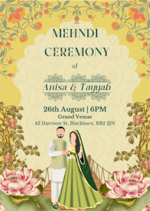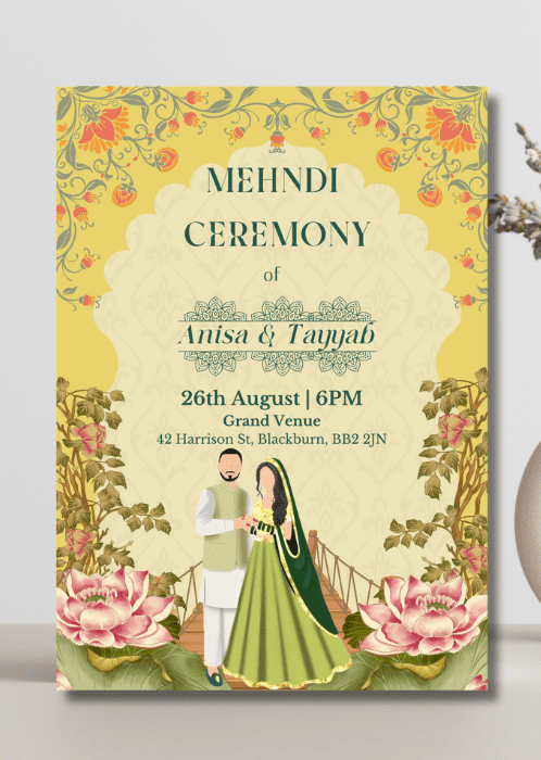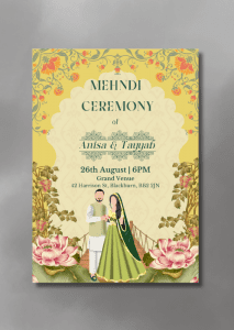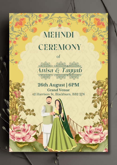 Our Lotus x Yellow Mehndi Invitation is a lovely way to welcome your loved ones on your special day. This invitation features a yellow backdrop with delicate floral patterns, and lotus flowers at the bottom of the card.