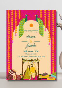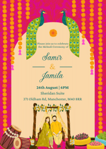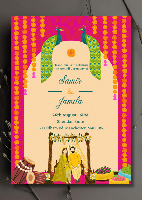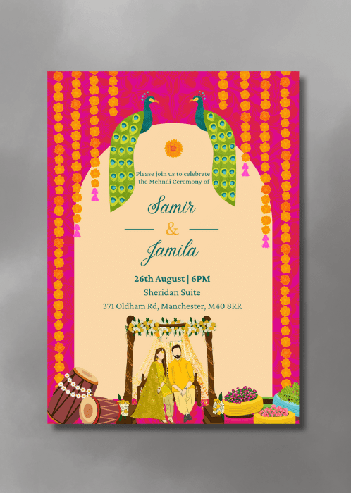 Announce all the official details with our Magenta x Peacocks Mehndi Invitation. This vibrant invitation with a magenta backdrop contrasted against the central cream archway, with peacocks perched at the top of the arch and strung of marigolds flowing down the sides.