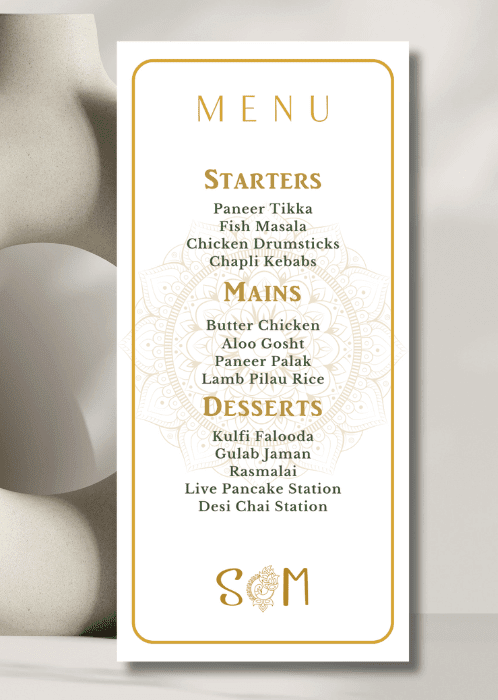 Our elegant Mandalas Menu announces all the dining details in store for your beloved guests. This beautiful design features a golden frame with an intricate gold mandala positioned in the background.