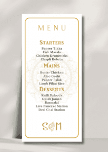 The card delicately displays your initials along with the delicious details of your starter, main course and dessert options.