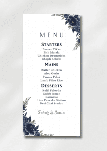 The card delicately displays your names along with the delicious details of your starter, main course and dessert options.