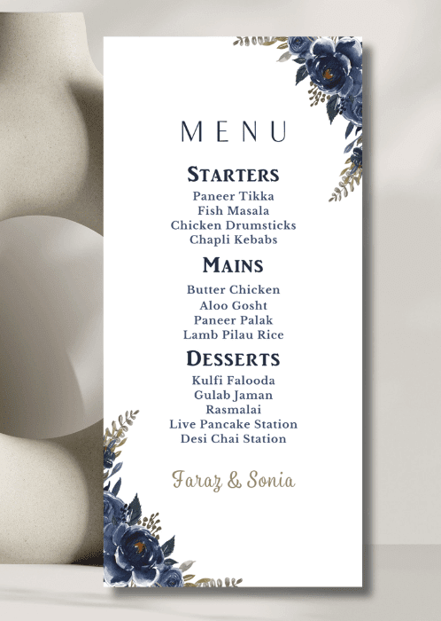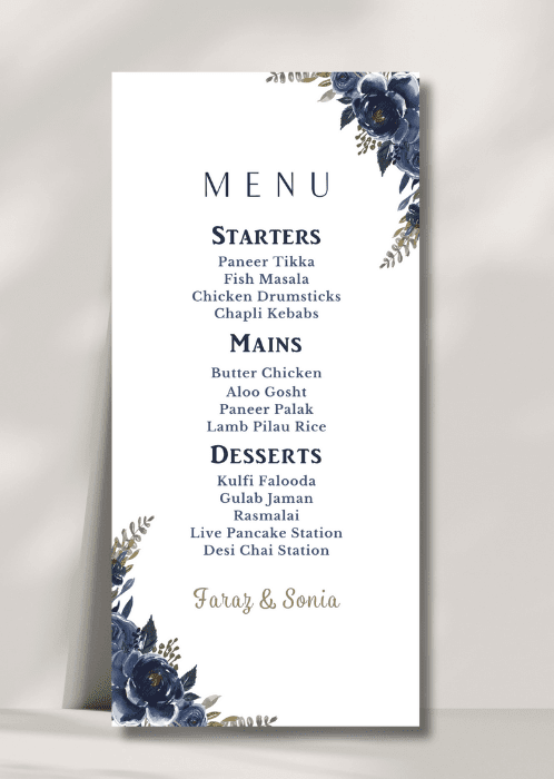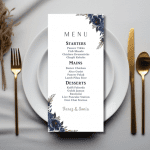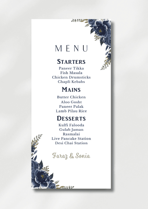 Our elegant Midnight Blue Garden Menu announces all the dining details in store for your beloved guests. This beautiful design features delicate blooms in shades of midnight blue and accented with sage green foliage.