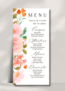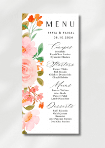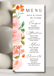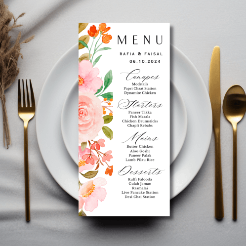 Our elegant Minimal Elegance Menu announces all the dining details in store for your beloved guests. This beautiful design features blooms rendered in a palette of blush pink and vibrant coral framing the details.