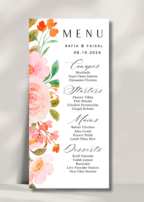 The card delicately displays your names and wedding date before disclosing the delicious details of your canapes, starters, main course and dessert options.