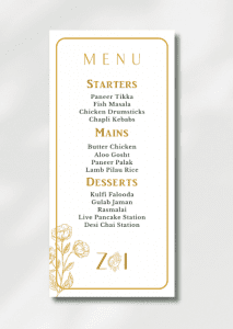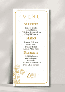 The card delicately displays your initials along with the delicious details of your starter, main course and dessert options.