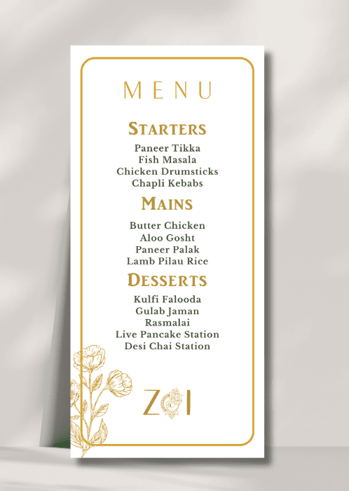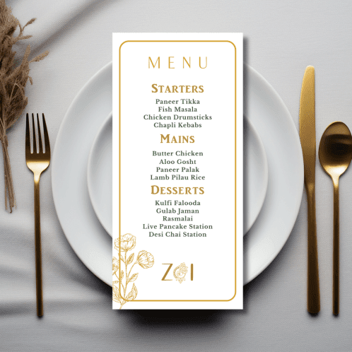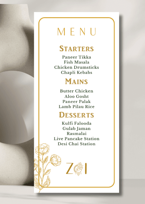 Our elegant Minimal Luxe Gold Menu announces all the dining details in store for your beloved guests. This beautiful design features a golden frame with a golden floral motif.