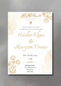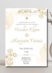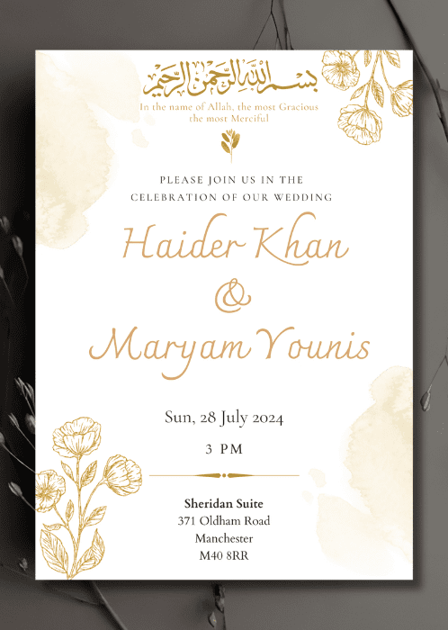 Announce all the official details with our Minimal Luxe Gold Wedding Invitation. The delicate watercolour washes in muted gold and cream with golden floral motifs framing the main details.