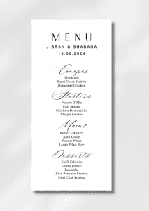 Our elegant White Minimalist Menu announces all the dining details in store for your beloved guests. This beautiful design features a simple minimal menu with a white background and black text.