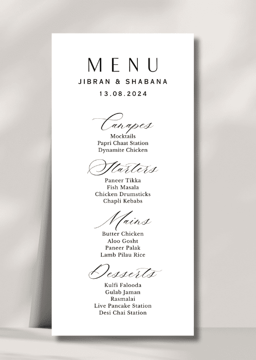 The card delicately displays your names and wedding date before disclosing the delicious details of your canapes, starters, main course and dessert options.