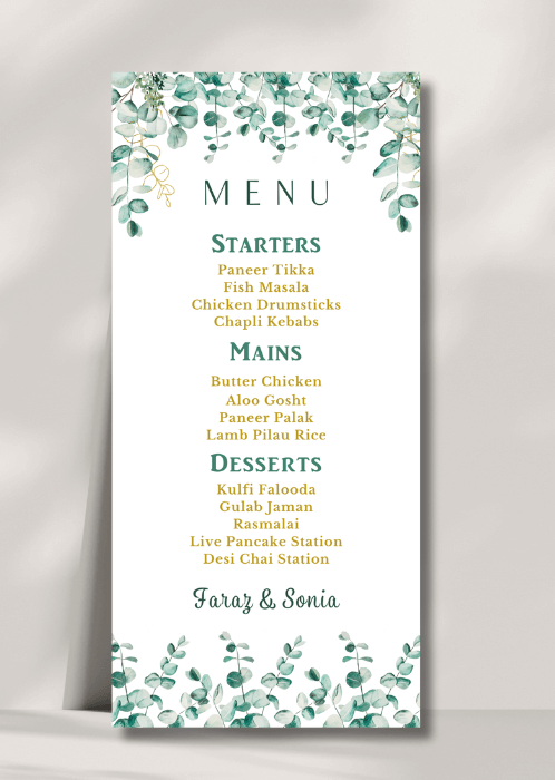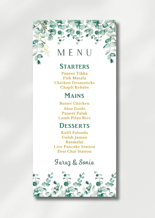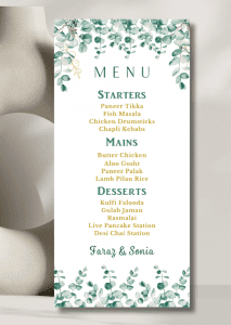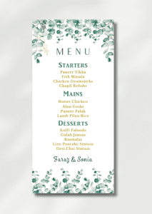 The card delicately displays your names along with the delicious details of your starter, main course and dessert options.