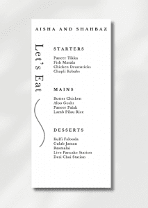 The card delicately displays your names before disclosing the delicious details of your starter, main course and dessert options.