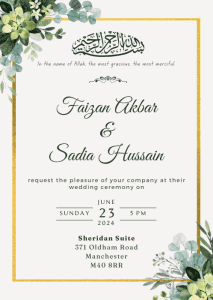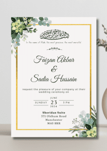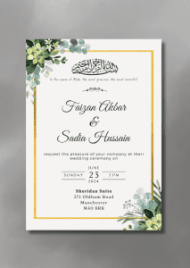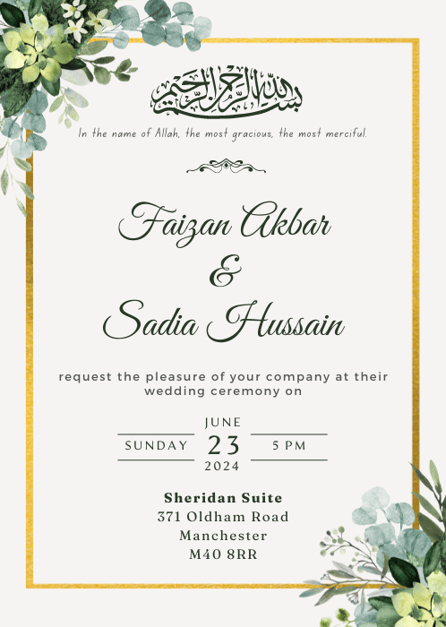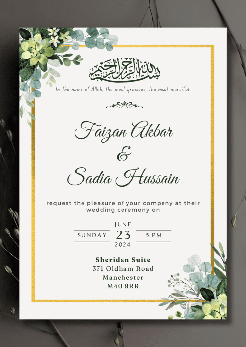 Welcome your guests in style with our Minimalist Green x Gold Wedding Invitation. The delicate watercolour eucalyptus branches in muted greens and whites framing the main details with a gold border.