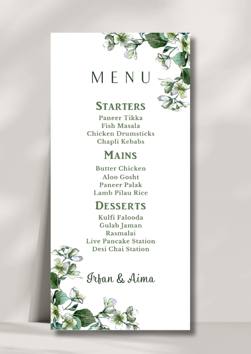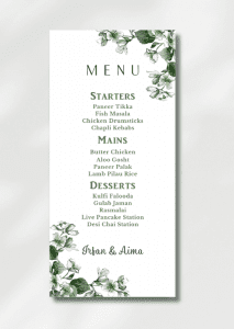 The card delicately displays your names along with the delicious details of your starter, main course and dessert options.