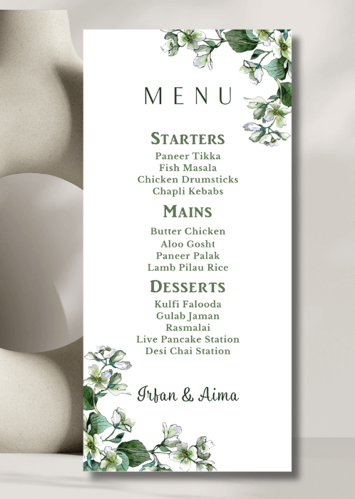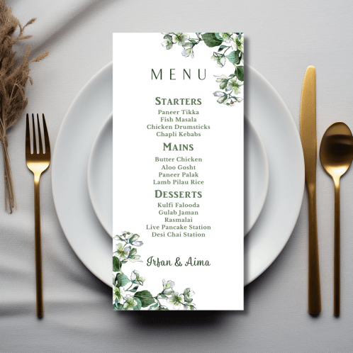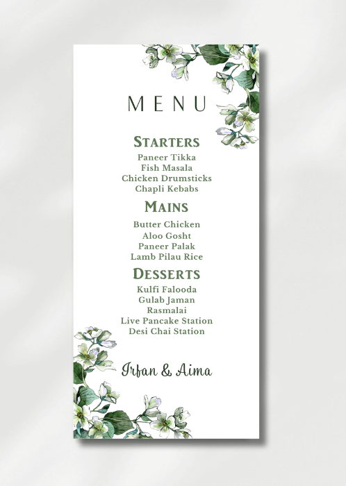 Our elegant Minimalist Jasmine Garden Menu announces all the dining details in store for your beloved guests. This beautiful design features delicate watercolour jasmine flowers rendered in ethereal whites and greens framing the main details.