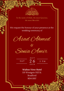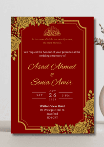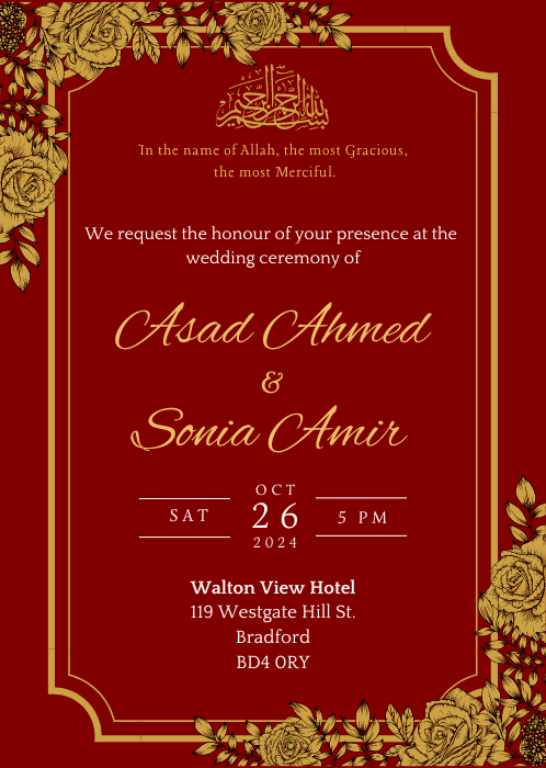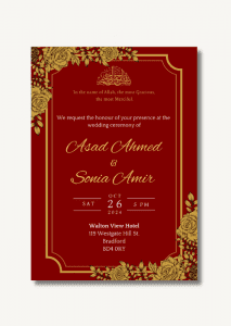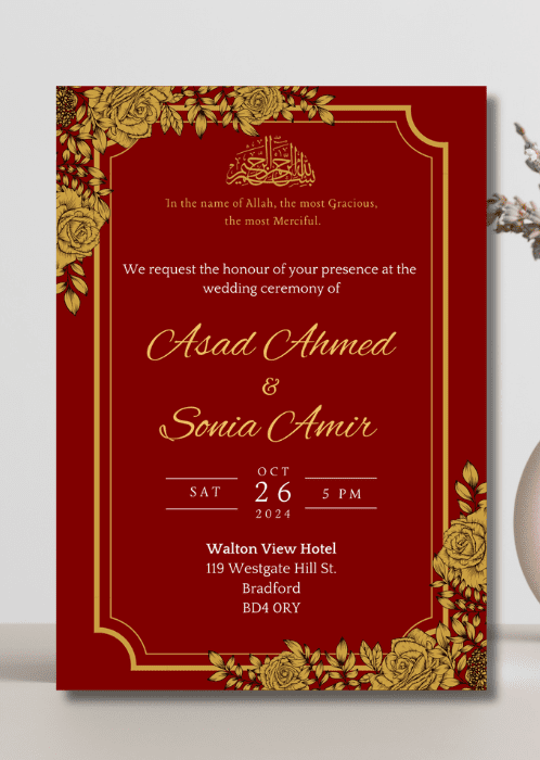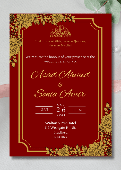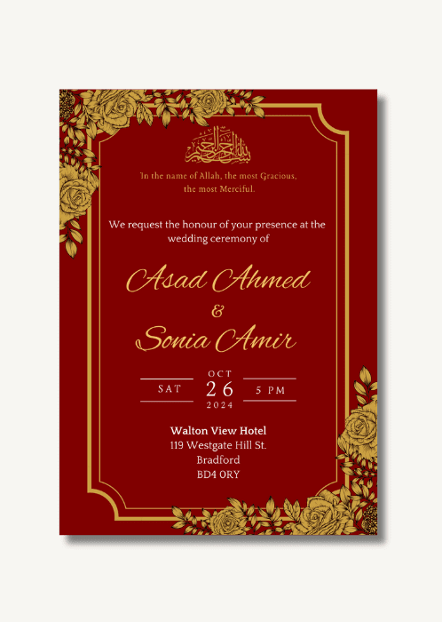 Set the tone for your upcoming wedding with our Luxe Gold Rose Wedding Invitation. This design features a deep opulent red backdrop with gold roses surrounding the details.
