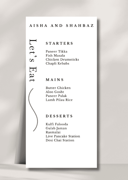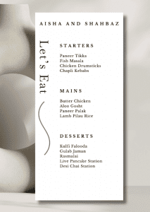 The card delicately displays your names before disclosing the delicious details of your starter, main course and dessert options.
