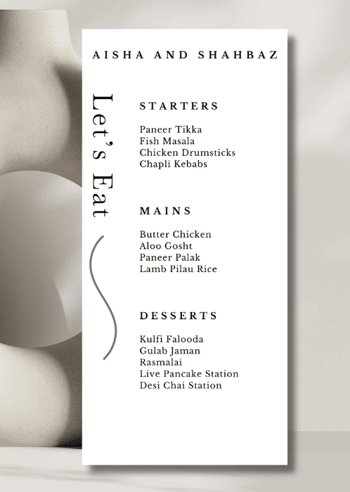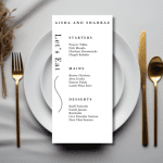 Our elegant Minimalist Menu announces all the dining details in store for your beloved guests. This beautiful design features a simple minimalist menu with a white background and black text.