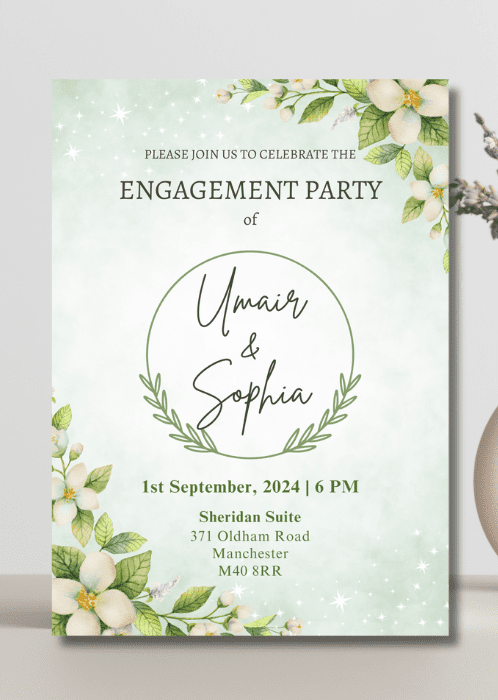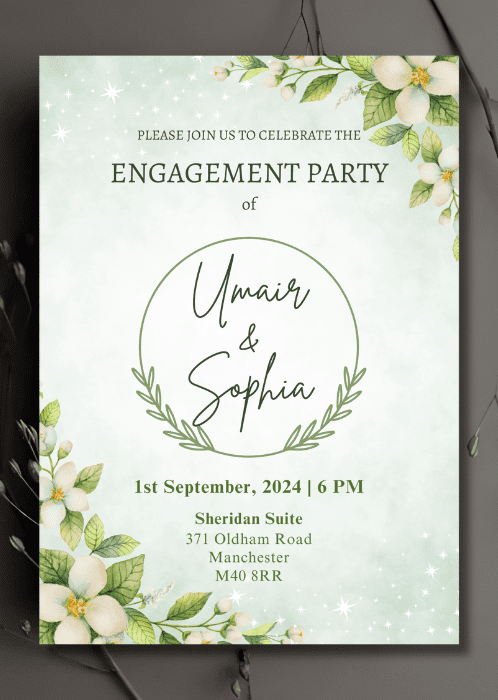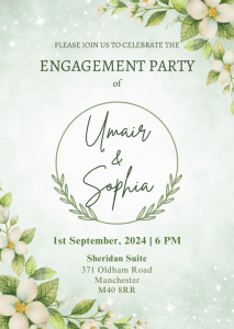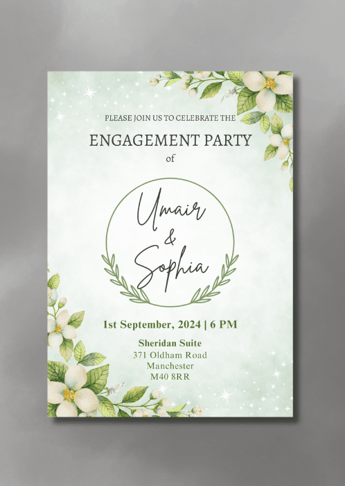 Our Sage Green x Pastel Engagement Invitation is a lovely way to welcome your loved ones on your special day. This design features a colour palette of soft sage green and white combined with delicate watercolour illustrations of blossoming flowers against a pastel backdrop.