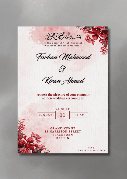 Set the tone for your upcoming wedding with our Misty Deep Red Wedding Invitation. This invitation features a delicate watercolour wash in blush tones with crimson and burgundy floral arrangements framing the details.