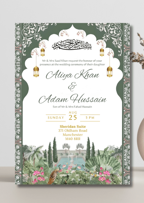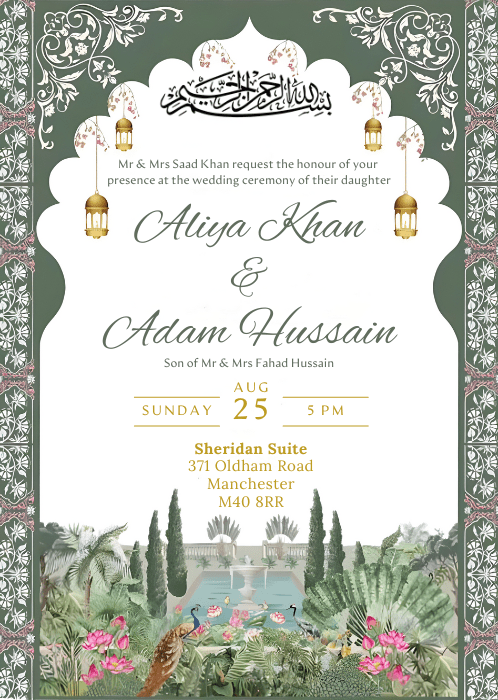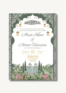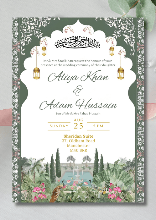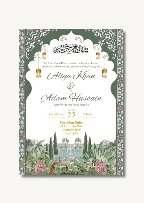 Our Mughal Garden Wedding Invitation is a lovely way to welcome your loved ones on your special day. This design features an ornate frame reminiscent of Mughal architecture including peacocks & blooming lotuses.