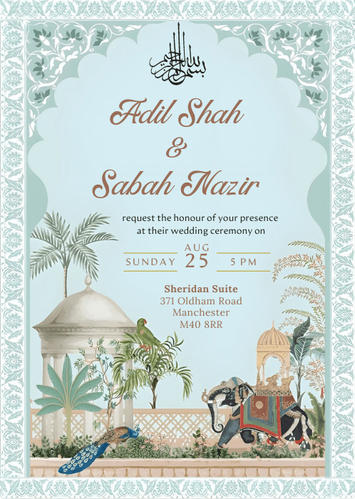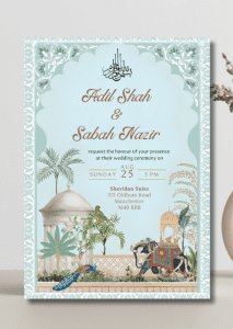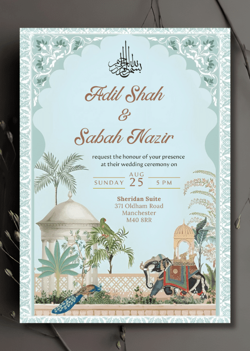 Announce all the official details with our Mughal x Serene Blue Wedding Invitation. This design features a serene blue backdrop intricately framed by arabesque borders.