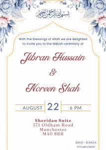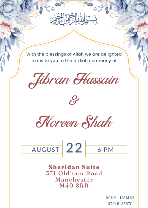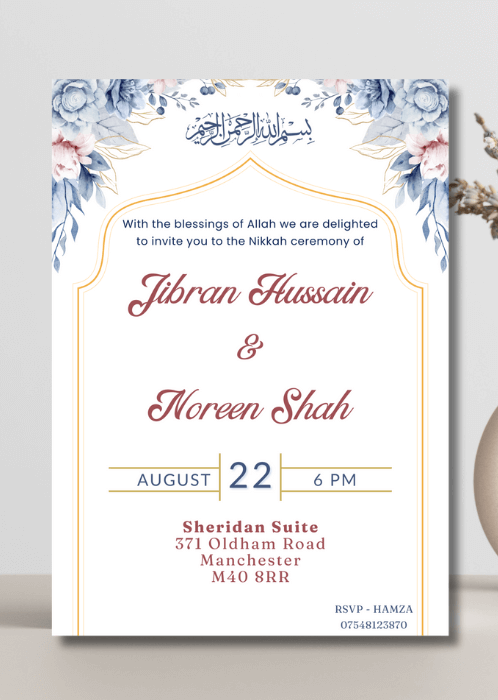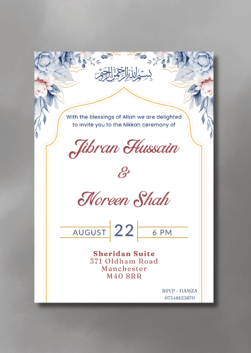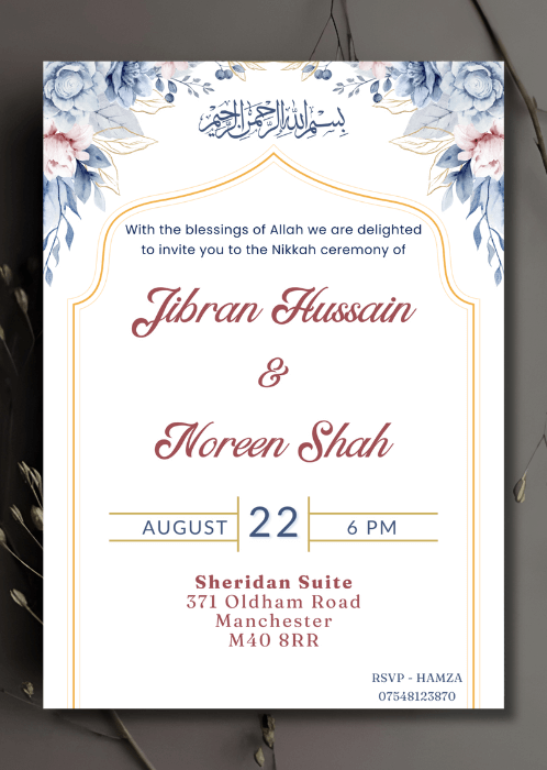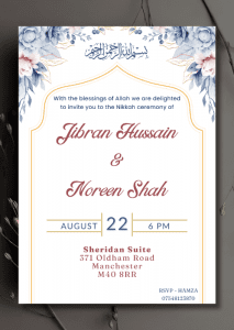 Welcome your guests in style with our elegant Muted Blues Motifs Nikkah Invitation. This delicate design features floral motifs rendered in muted blues and blush pinks.