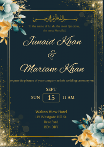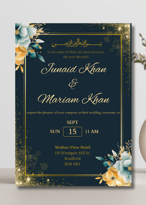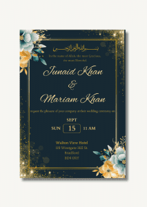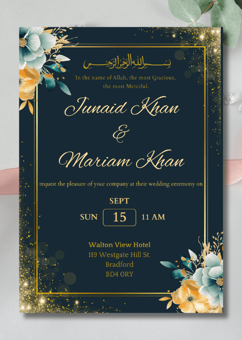 Welcome your guests in style with our elegant Navy x Gold Accents Wedding Invitation. This design features a deep navy background with gold accents framing the details and a mimic of scattering stardust.