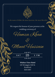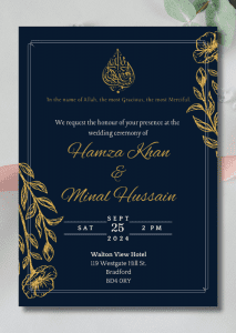 Welcome your guests in style with our elegant Navy x Night Sky Wedding Invitation. This design features a navy backdrop reminiscent of a night sky with delicate gold floral illustrations framing the details.