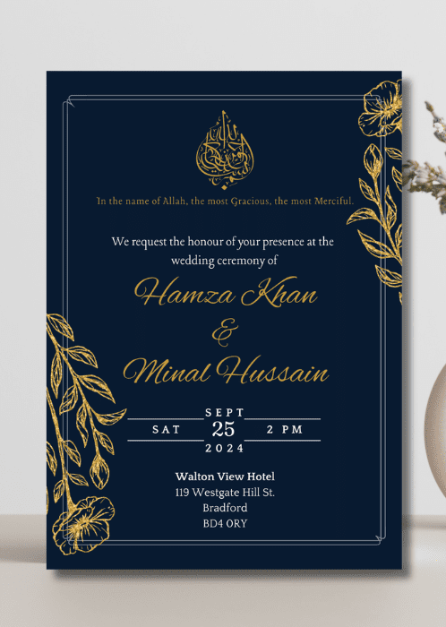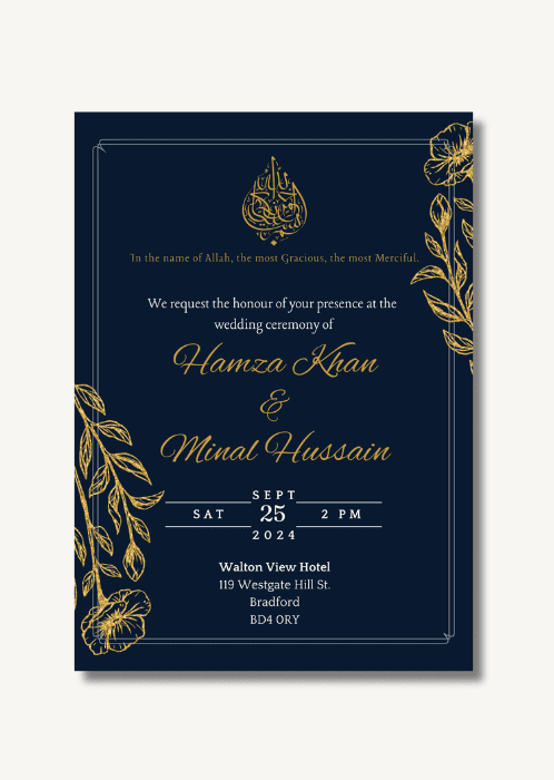 Welcome your guests in style with our elegant Navy x Night Sky Wedding Invitation. This design features a navy backdrop reminiscent of a night sky with delicate gold floral illustrations framing the details.
