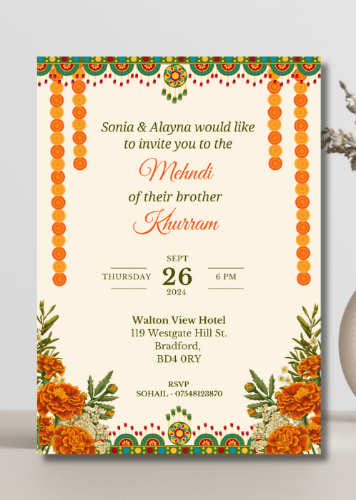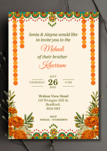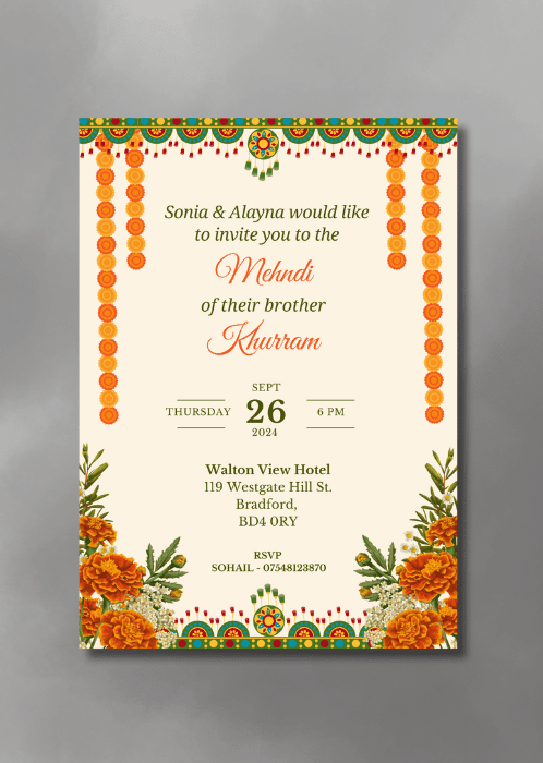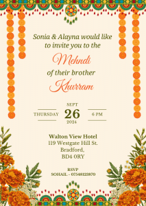 Our Orange Hues x Marigolds Mehndi Invitation is a lovely way to welcome your loved ones on your special day. This design features rich warm orange hues with intricate floral borders and cascading marigold garlands.