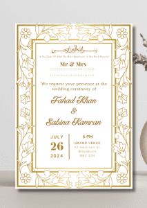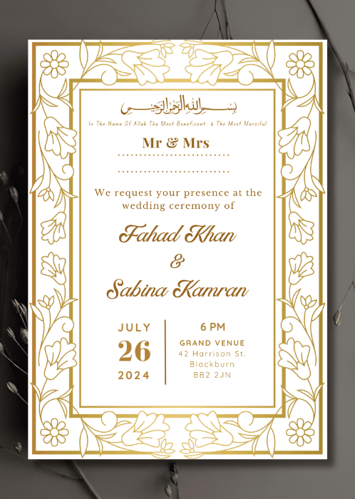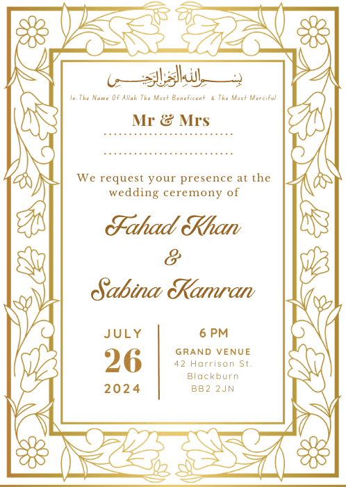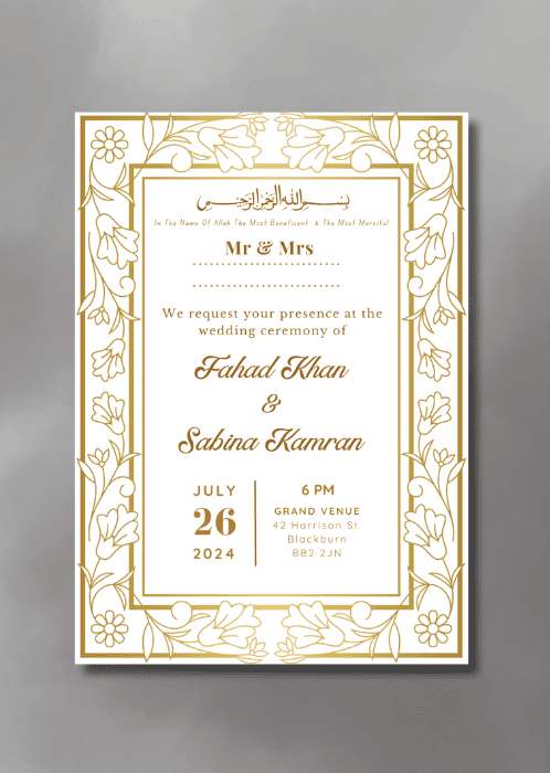 Announce all the official details with our Ornate x Gold (Mr&Mrs Guest) Wedding Invitation. The ornate gold frame reminiscent of Mughal architecture with its delicate floral motifs.