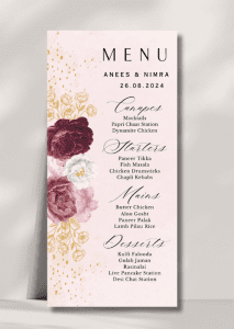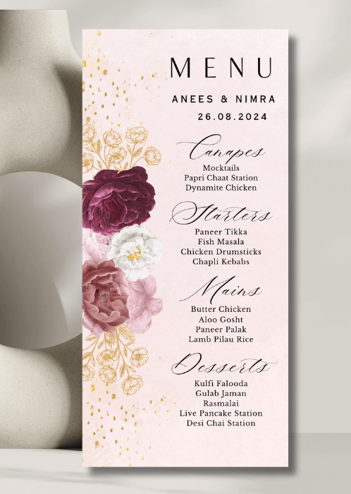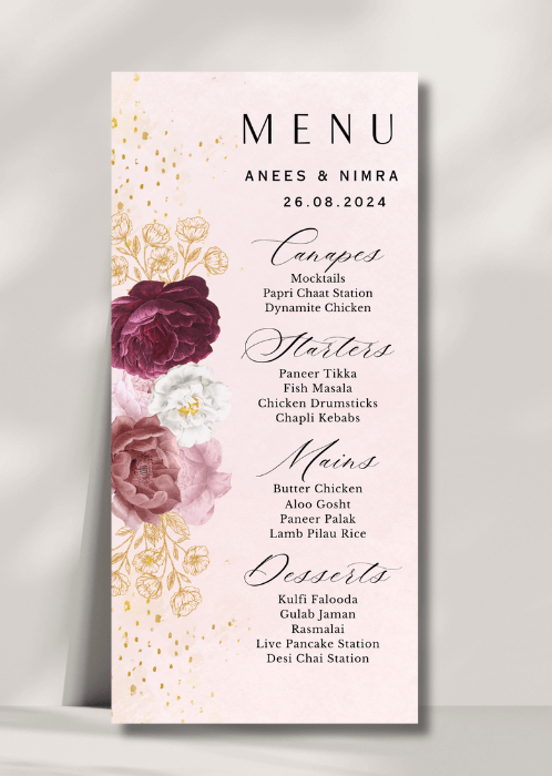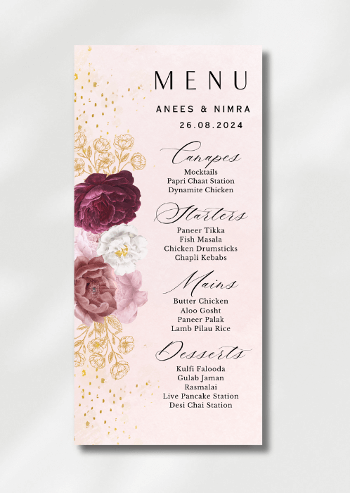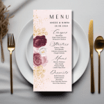 Our elegant Pink Clusters Menu announces all the dining details in store for your beloved guests. This beautiful design features delicate watercolour flowers rendered in shades of blush pink and deep burgundy.