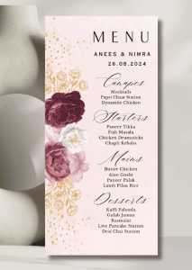 The card delicately displays your names and wedding date before disclosing the delicious details of your canapes, starters, main course and dessert options.