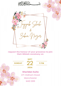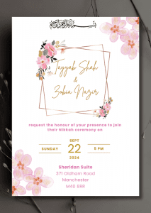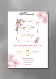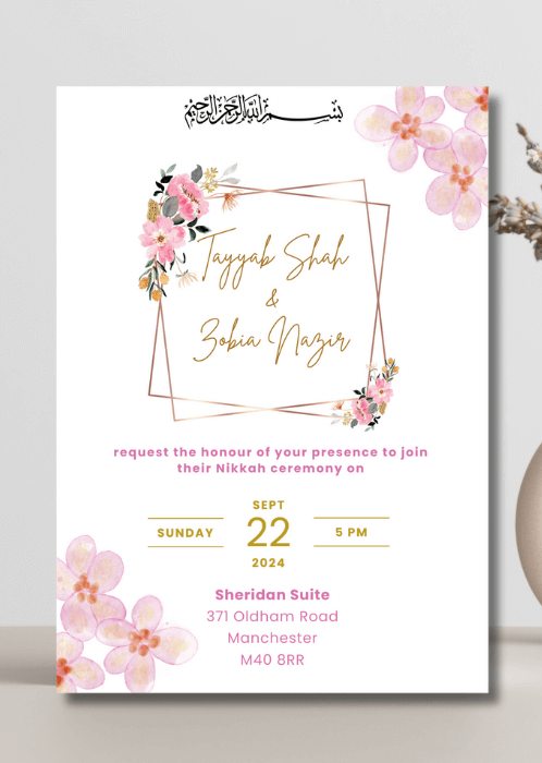 Our Pink Florals x Geo Nikkah Invitation is a lovely way to welcome your loved ones on your special day. This design features delicate pink flowers placed on a geometric frame.