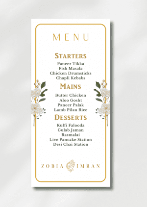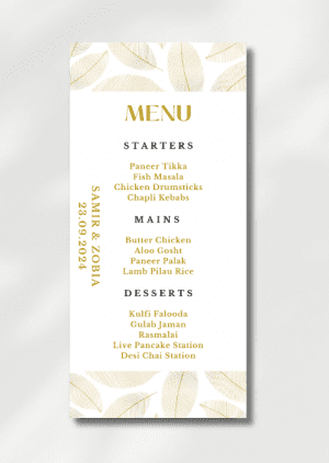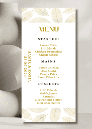 The card delicately displays your names and wedding date before disclosing the delicious details of your canapes, starters, main course and dessert options.