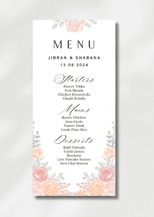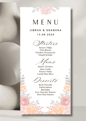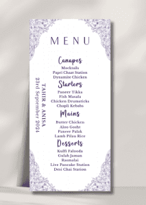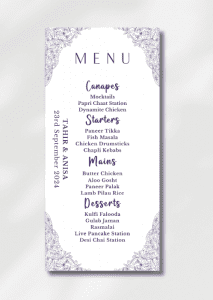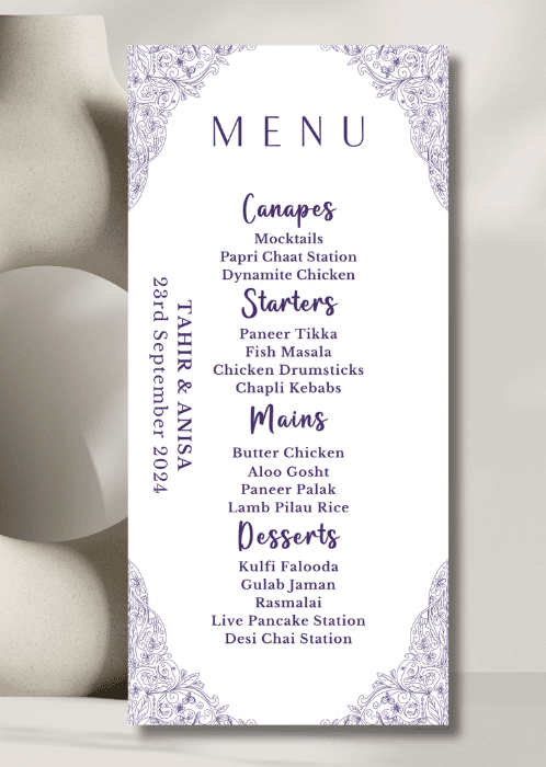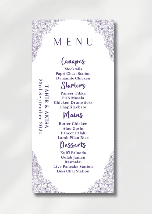 Our elegant Purple x Floral Menu announces all the dining details in store for your beloved guests. This beautiful design features intricate purple floral borders framing the details.