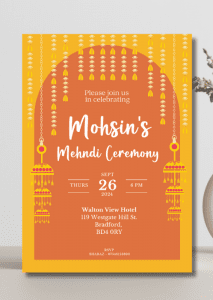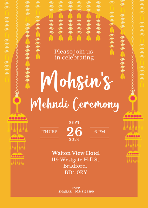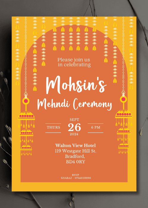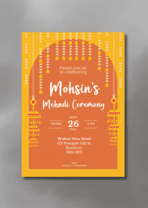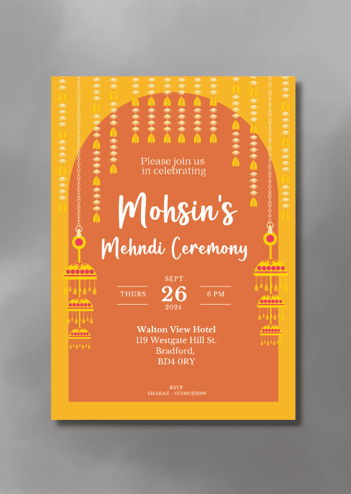 Set the tone for your upcoming event with our Rich Orange Hues Mehndi Invitation. This design features rich orange hues with cascading floral motifs reminiscent of marigolds.