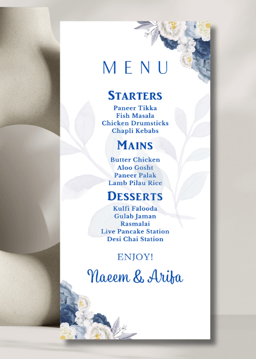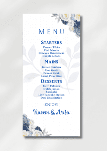 The card delicately displays your names along with the delicious details of your starter, main course and dessert options.