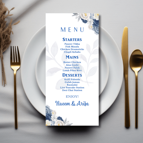 Our elegant Serene Blue Clusters Menu announces all the dining details in store for your beloved guests. This beautiful design features a palette of serene blues and pristine whites.