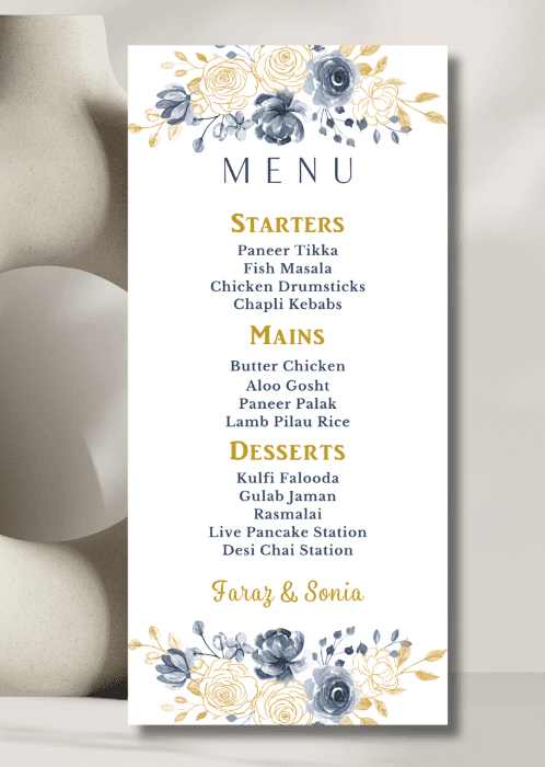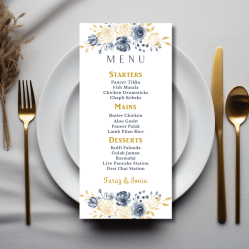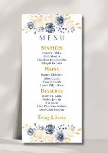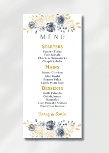 The card delicately displays your names along with the delicious details of your starter, main course and dessert options.