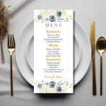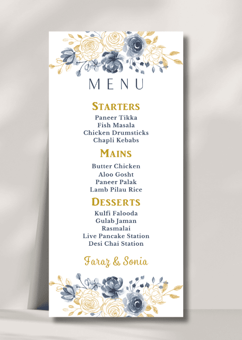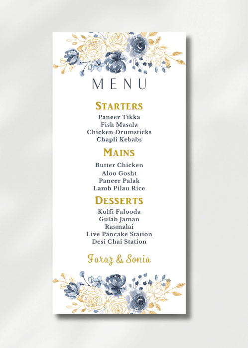 Our elegant Serene x Gold Splash Menu announces all the dining details in store for your beloved guests. This beautiful design features the dominant use of serene blue and gold in the watercolour floral arrangement.