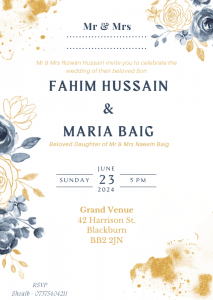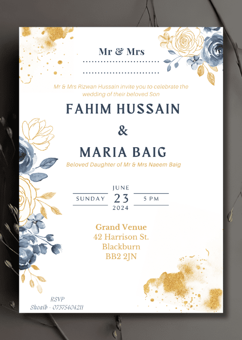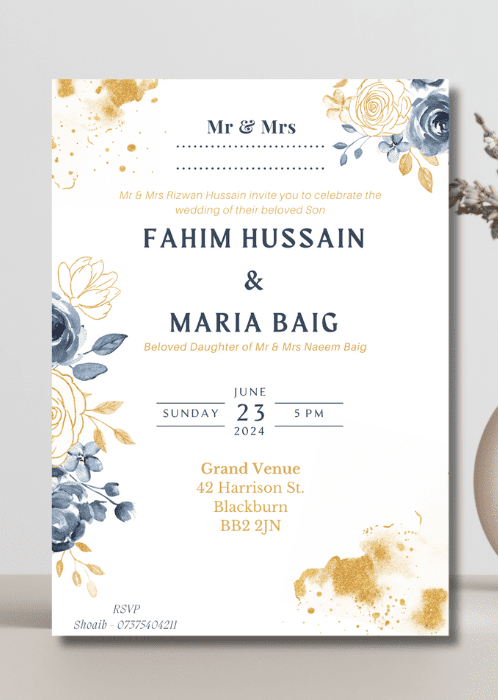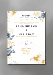 Welcome your guests in style with our Serene x Gold Splash Wedding Invitation. This invitation consists of the dominant use of serene blue in the watercolour floral arrangement offset by the generous splashes of gold framing the floral arrangement.