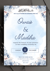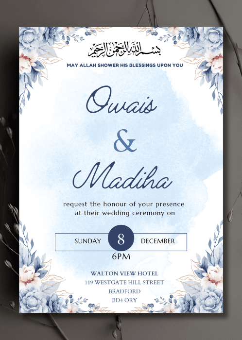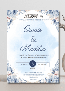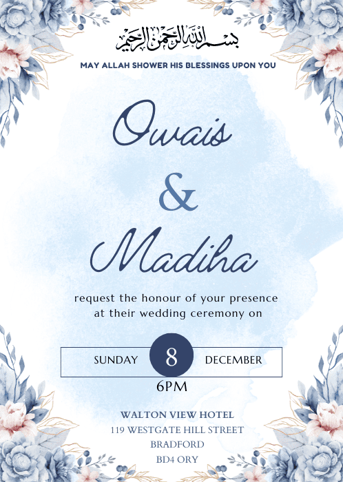 Announce all the official details with our Soft Blue Accent Wedding Invitation. The soft watercolour-like hues of blue and pink in the floral arrangements with delicate gold accents woven through the floral borders.