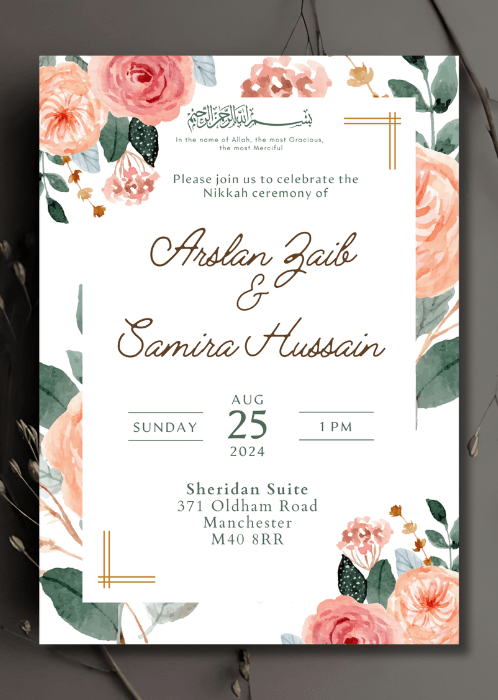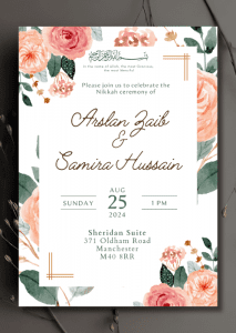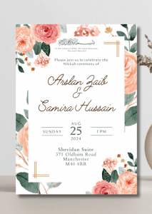 Welcome your guests in style with our elegant Soft Blush x Peach Hues Nikkah Invitation. This delicate design features roses rendered in soft blush and peach hues.