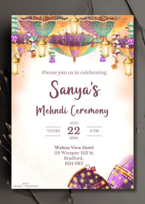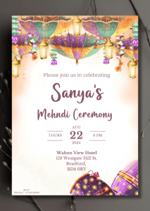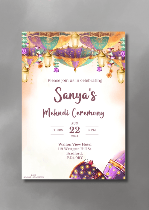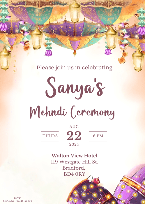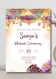 Welcome your guests in style with our elegant Soft Pastel Hues Mehndi Invitation. This design features a soft pastel palette with coloured umbrellas strung with delicate floral garlands, and drums adorned with intricate designs and twinkling lights.