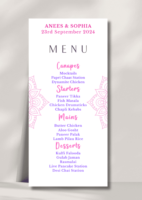 The card delicately displays your names and event date before disclosing the delicious details of your canapes, starters, main course and dessert options.