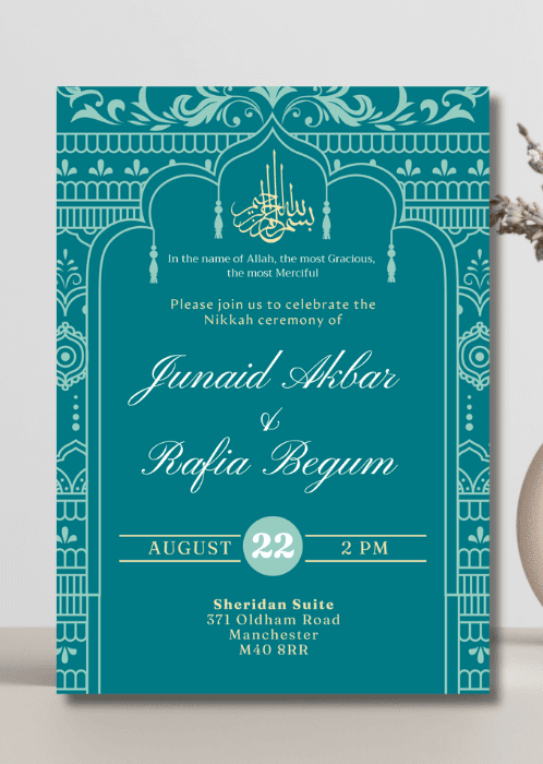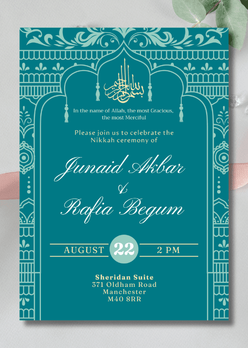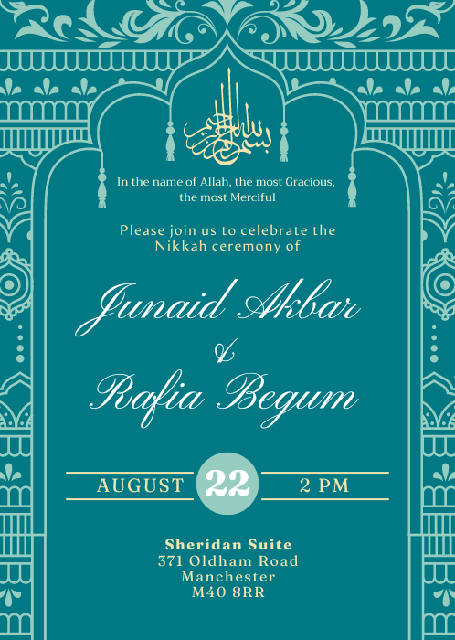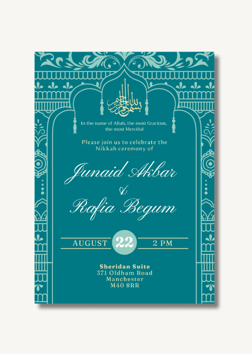 Set the tone for your upcoming wedding with our Teal Arabesque Arch Nikkah Invitation. The intricate arabesque patterns rendered in a teal and gold palette framing the details with an archway.
